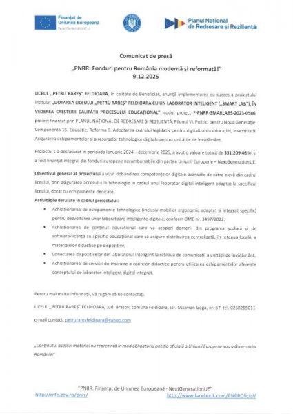 Comunicat de presă -„DOTAREA LICEULUI „PETRU RAREȘ” FELDIOARA CU UN LABORATOR INTELIGENT („SMART LAB”), ÎN VEDEREA CREȘTERII CALITĂȚII PROCESULUI EDUCAȚIONAL”