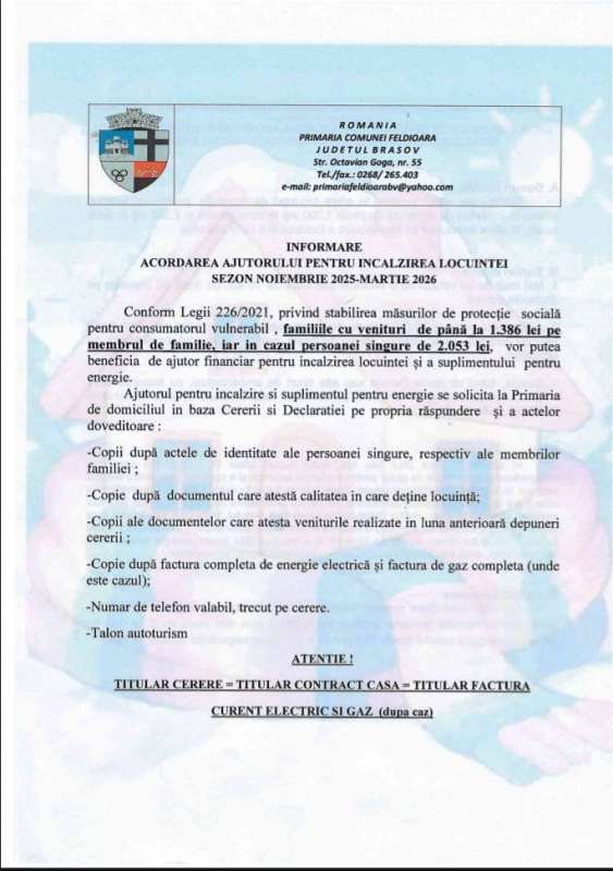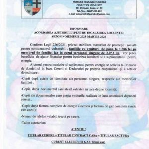 Informare privind acordarea ajutorului de încălzire a locuinței pentru sezonul noiembrie 2025-martie 2026